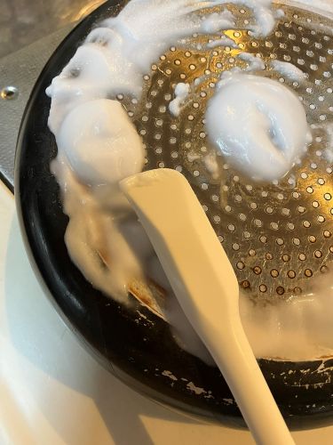 すると、水と重曹を混ぜてホイップ状にし、それを鍋底に載せれば落ちる、という情報に行き当たった。