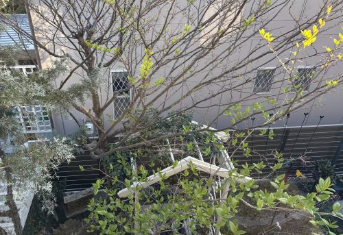洗濯物を干しながら、二階のベランダから庭の木々を見る。