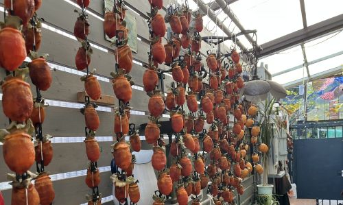その反省から、今年は干し始めを5日ほど遅らせてみた。干してすぐの二日ほどは高温の日が続いたが、その後は急激に気温が下がり、ぐっと冷え込む日が続いた。そのおかげか、一週間も経つと柿は段々と干し柿らしく締まり、手で軽く揉むと白い粉を吹くほどに成長した。農家の方によれば、鮮やかなオレンジ色をした羊羹のような「ころ柿」になるという。