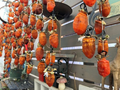 勝手口を開けて作業していると、通りがかった人が「絵になりますねぇ」と家人に声をかけていた。干し柿が風に揺れるだけの、なんでもない日常の景色である。けれど、こうした季節の手仕事が家の前にあるだけで、心が少し満たされる。