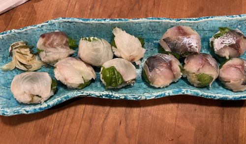 その思い出の手毬寿司を、このたび姪が作ってくれた。小松の魚屋で刺身用の鯵を見つけ、三枚に下ろしてもらい、数日酢に漬けていたという。今朝、「手毬寿司を作ろうか」と彼女が言ったとき、私は思わず声を裏返して「大葉を敷いた、あの手毬寿司?」と尋ねた。すると彼女はあっさりと「そうよ」と答えた。