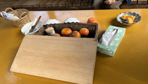庭先には試食コーナーがあり、柿と皿とナイフが置かれている。