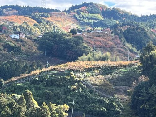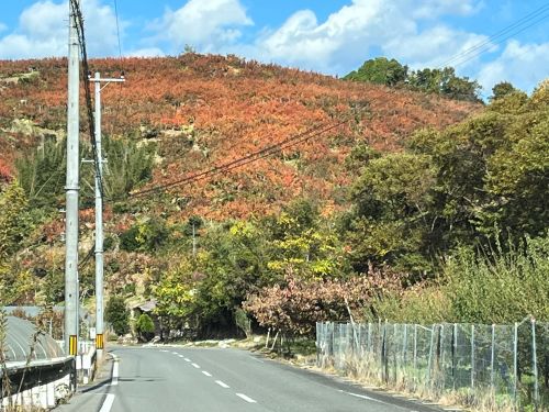京奈和道路の五條インターに差しかかると、遠い山肌にオレンジ色の帯が見える。