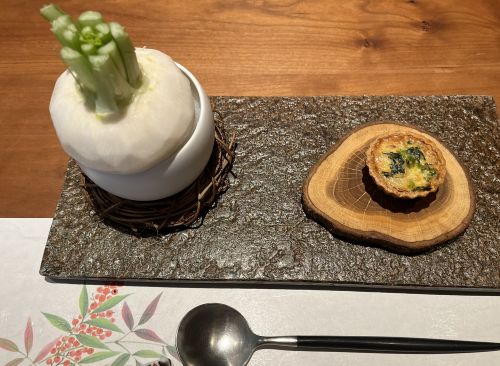 この日の前菜は蕪のスープと小さなキッシュ。葉付きの蕪が蓋になる愛らしい演出に思わず笑みがこぼれる。蓋を取れば真っ白なメレンゲの下に蕪のスープのやさしい香り。熱々のキッシュも格別だった。