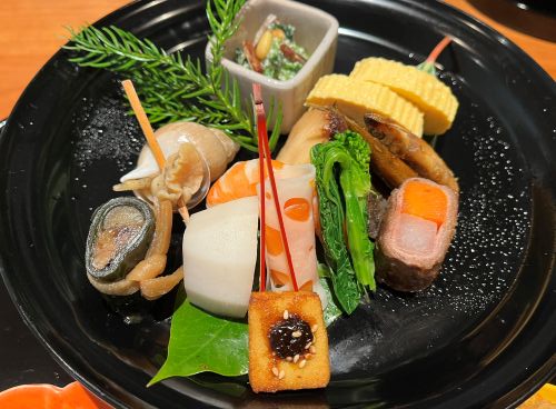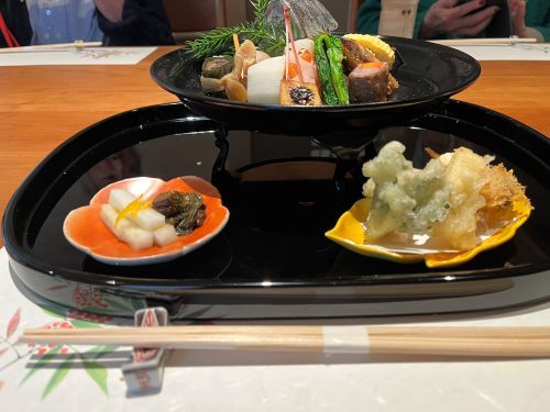 続くお弁当には、煮もの、焼きもの、あえもの、揚げもの、お造りとひと通り。どれも彩りよく、丁寧に仕立てられている。美味しさの重なりに、二時間半の道のりを忘れてしまう。