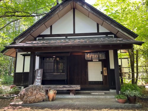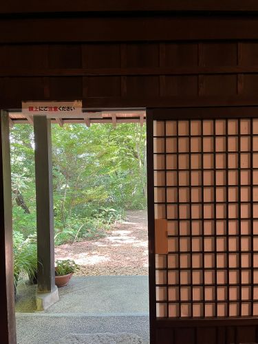 くぐり戸を頭を低くして抜けると、そこは靴脱ぎ場。中に入れば、大きな囲炉裏が迎えてくれる。座敷の外には、緑があふれるように降りかかっていた。ふと気づけばエアコンがない。それでも室内は自然の風が心地よく、涼しさに満ちていた。