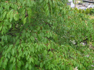 家の屋根より高い山桜に小鳥の姿は見ないが大鳥のひよどりの鋭いくちばしで、見事に実は消えかけている。