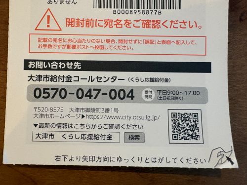 そんな中、大津市から「くらし応援給付金7000円」の通知が届いた。
