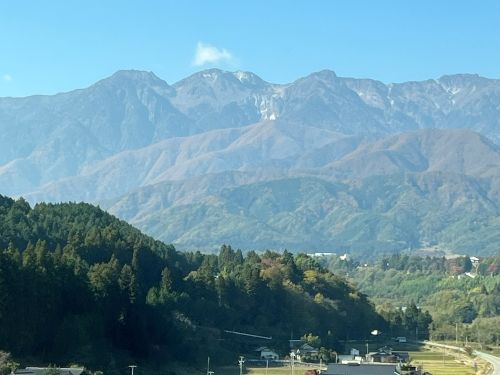 山は裾野まで赤く染まり、まさに全山紅葉。杉やヒノキが少ないせいか、山肌がどこまでも燃えるように美しい。