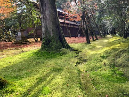 「白生山」の額が掲げられた古い山門をくぐると、苔むした参道の先に紅葉が陽射しを受けてちらちらと揺れ始めた。庭にある書院の屋根に散る紅葉の美しさといったら、声もなく見入ってしまう。屋根も、苔の庭も、どこを見ても紅葉の美しさが際立っていた。