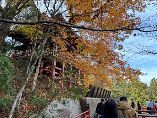 同行の友人たちも「天気に恵まれ、素晴らしい紅葉が見られた」と大喜びであった。ふだんは足が痛い、腰が痛いと言っているのも忘れ、「奇岩遊仙境」に驚きながら、急な階段を嬉々として登り、大悲閣(本殿)まで一息に到達した。本殿の本尊・十一面千手観世音菩薩は、これまで見たこともないほどの気品で鎮座しており、木曽檜の寄せ木造りで高さ7.8メートルと伝わる。