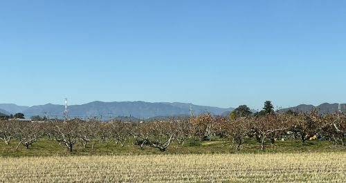 見渡すかぎり柿畑である。収穫を待つ富有柿が枝にたわわに残っている。まず一軒目の農場を訪ねたところ、贈答用の高級品はほぼ予約で埋まり、すでに受付は終了したとのこと。大垣の富有柿を送りたいと楽しみにしていた友人を少しガッカリさせてしまった。それでは、と次なる農場へ向かう。