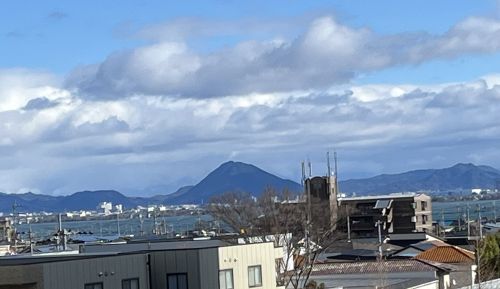 湖西線のホームから琵琶湖越しの近江富士(三上山)