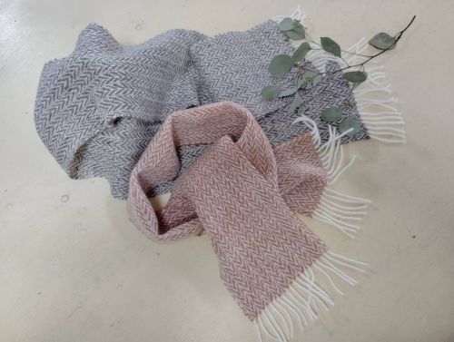 源毛から紡がれた糸で織られたマフラーやショールは、同じものが二つとない一点もの。
