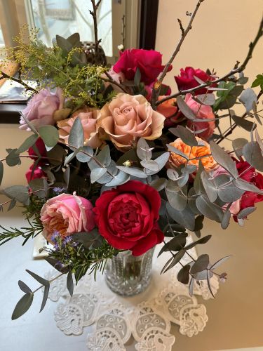 このクリアランスに向けて、お客様からバラの花束を頂いていたのですが、今日はその花束を作って下さった高槻のお花屋さんが会場に来て下さいました。