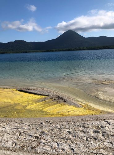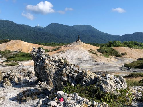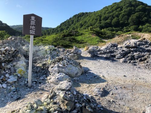 歩を進めるたびに、岩の隙間から湯気が立ち上る温泉の匂いが鼻をかすめ、地面の熱が足裏をじんわりと刺激する。遠くの山々は青空に映え、清々しい空気の中にひっそりと地獄の名前が刻まれている。夏の光と影のコントラストが、恐山の静謐さと神秘性をより際立たせていた。